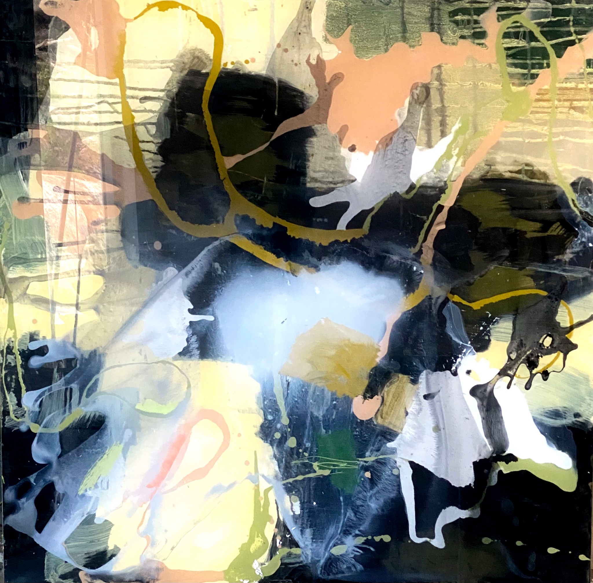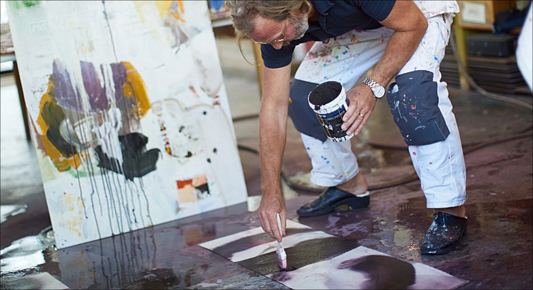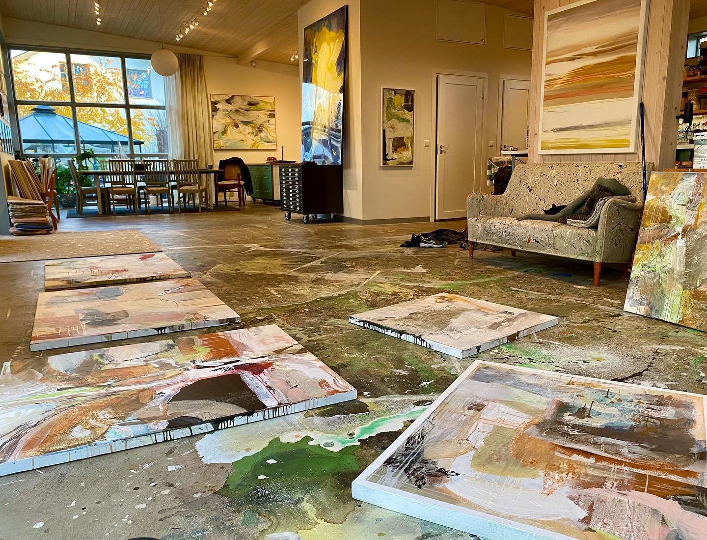 A lot of new things are promised! Anders Wallin started as a traditional watercolor artist but it became too sad and predictable, he wanted to move on. He started painting huge pictures, used the floor, large paint buckets, water hose and saw the possibilities in odd and reluctant materials such as tar and rag paper. He developed his collaboration with chance. He sets the material, the colors and the water in motion to curiously see what is happening. He usually works with a dozen paintings at the same time in an unpredictable painting process, but in the end it is always he who interrupts and decides that a picture is ready.